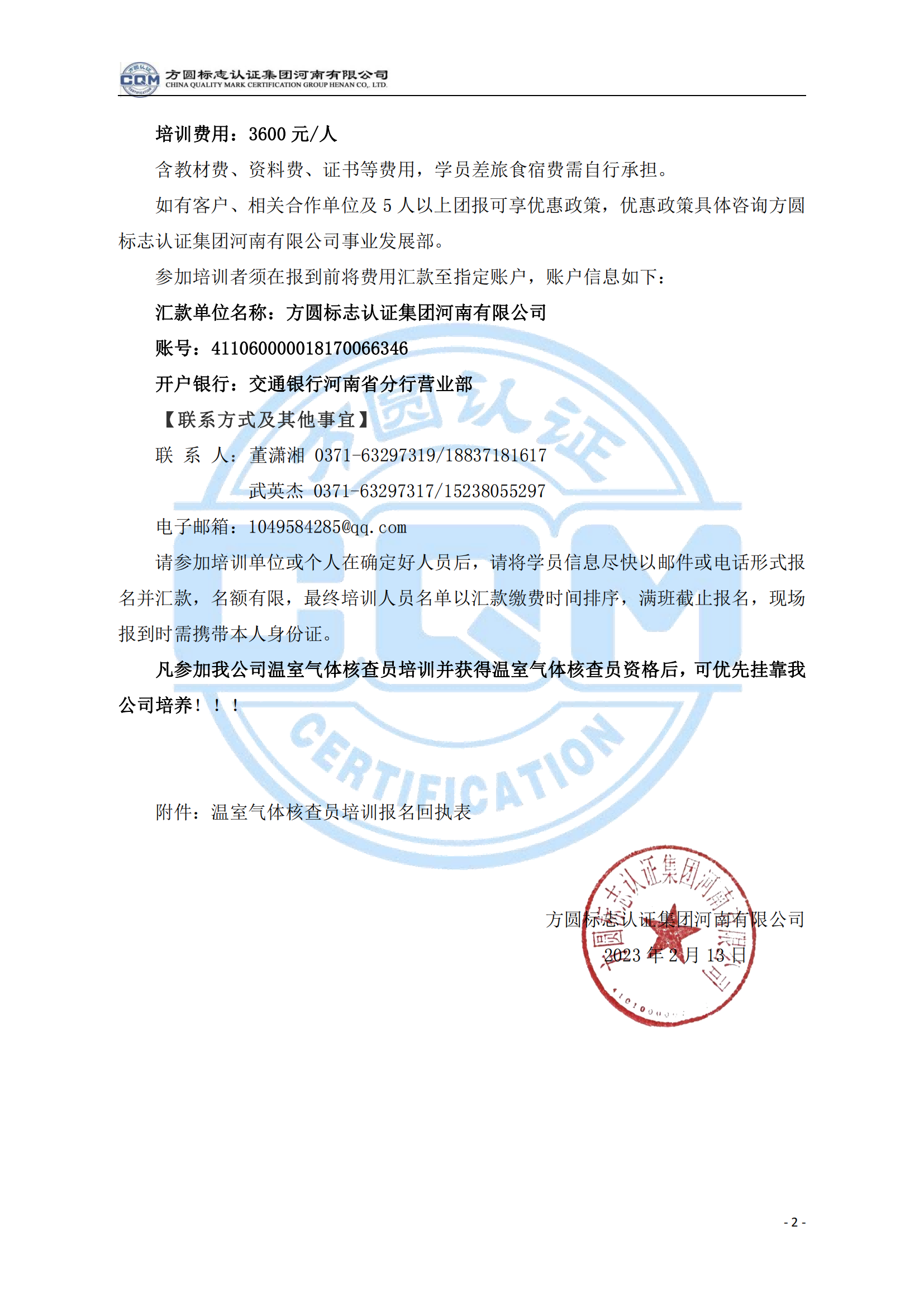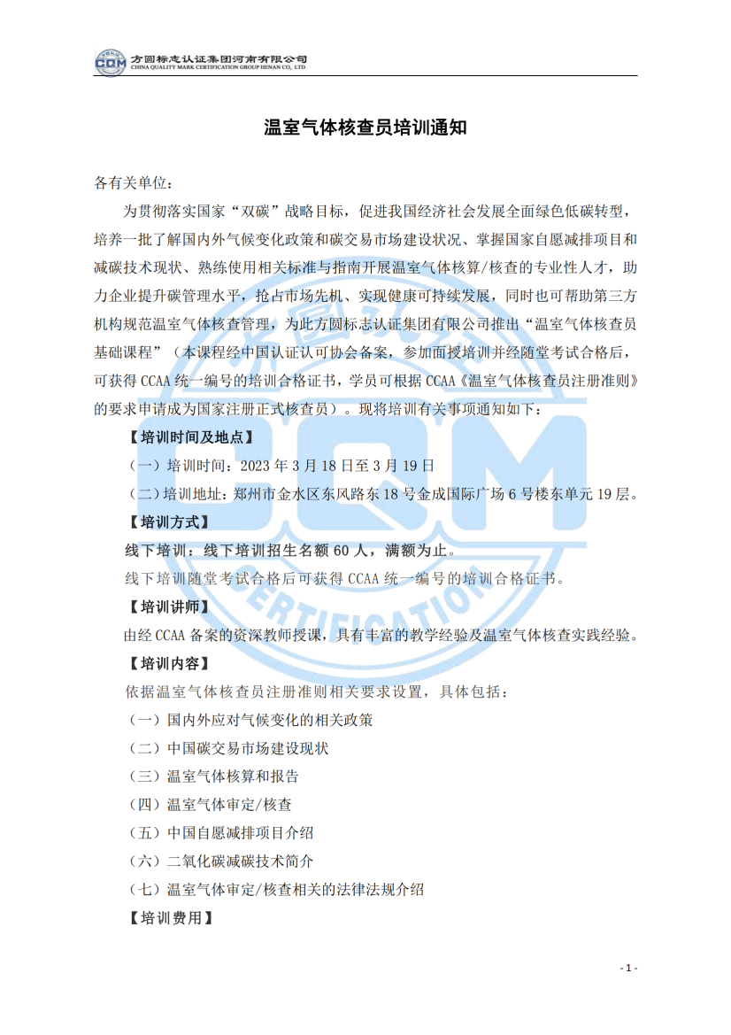 方圓標志認證集團河南有限公司關(guān)于舉辦溫室氣體核查員培訓班的通知